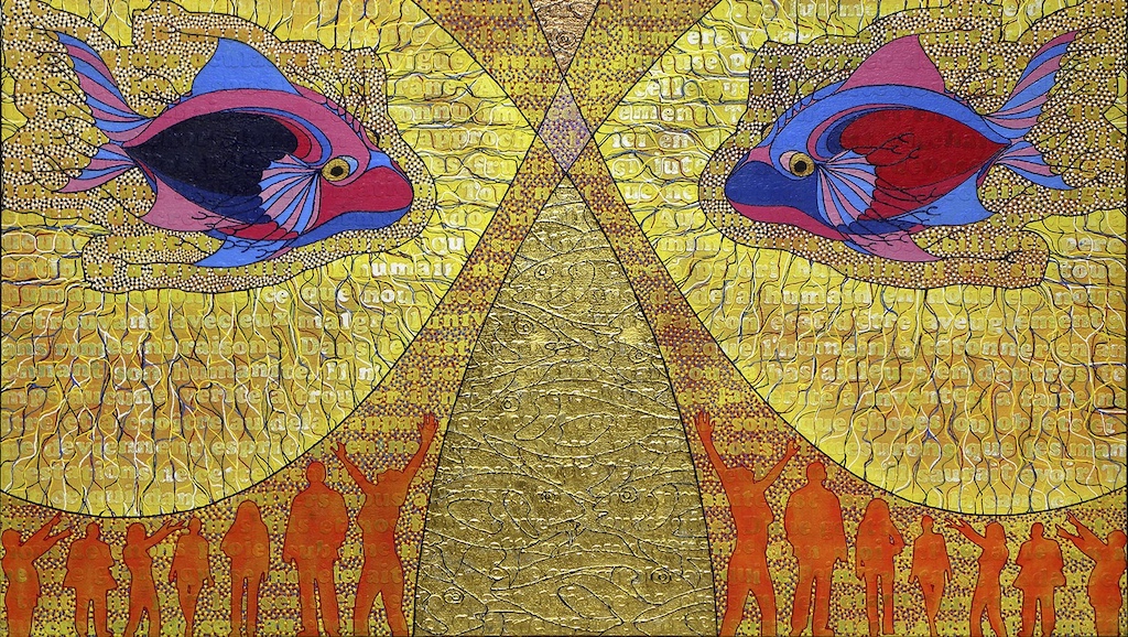 Peinture acrylique et feuille d’or sur caisson de bois, 76 x 123 cm